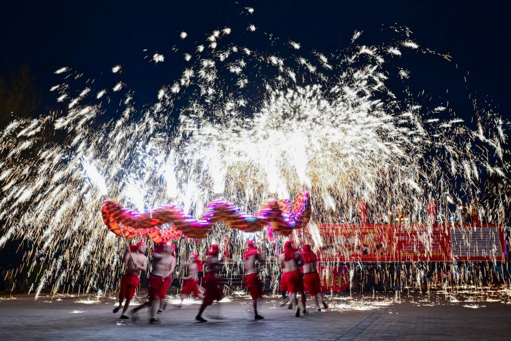??民間藝人在河南省洛陽(yáng)市2024隋唐河洛文化廟會(huì)上表演打鐵花(2024年2月14日攝)。新華社發(fā)(李衛(wèi)超攝)